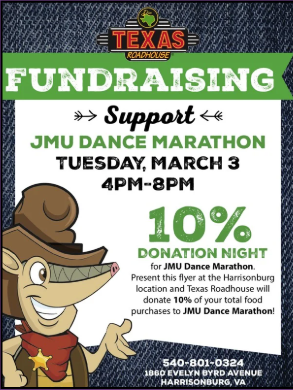 Come support JMU Dance Marathon at Texas Roadhouse for our proceeds night. Just mention JMU Dance Marathon when you get your check and 10% of your order will be donated to CMNH!