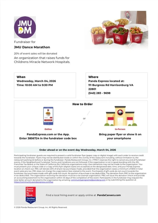 Come support JMU Dance Marathon at Panda Express from 9 AM - 10:30 PM! Make sure you show the flyer at checkout.